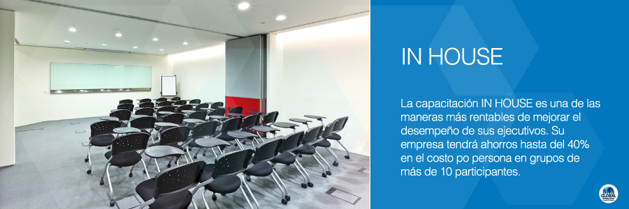 Cursos InHouse ¿Por qué elegir Capacitación In House? Flexibilidad La Capacitación In House puede llevarse acabo en su Empresa ó en un centro de Capacitación... Usted Elige!!!! los programas se diseñan y desarrollan de acuerdo a sus necesidades y consideramos la cultura organizacional de su empresa con el fin de dirigir objetivos de formación hacia la filosofía empresarial. Para lograr la efectividad de nuestros servicios en materia In House, contamos con un área Pedagógica Interna, la cual analiza la didactica mas adecuada para su personal de acuerdo a las características grupales y competencias individuales con el fin de desarrollar la adecuación de los programas, ó aun para combinar 2 o mas temas que hayan sido de su interés para integrarlos en uno solo. Nuestros programas pueden llevarse acabo desde 3 horas hasta 104 horas de entrenamiento en nuestros diplomados. Metodología Nuestros Servicios de Capacitación y Formación están basados en una Metodología totalmente practica, en donde el grupo a capacitar asimila los conocimientos a través de la expertise de nuestros Ponentes y la auto-experimentación. Van mas allá del sentido tradicional ya que su empresa recibe un compromiso de capacitación con valores agregados que reducirán sus costos de operación, optimizara lo recursos existentes y obtendrá un clima de armonía y compromiso en su empresa